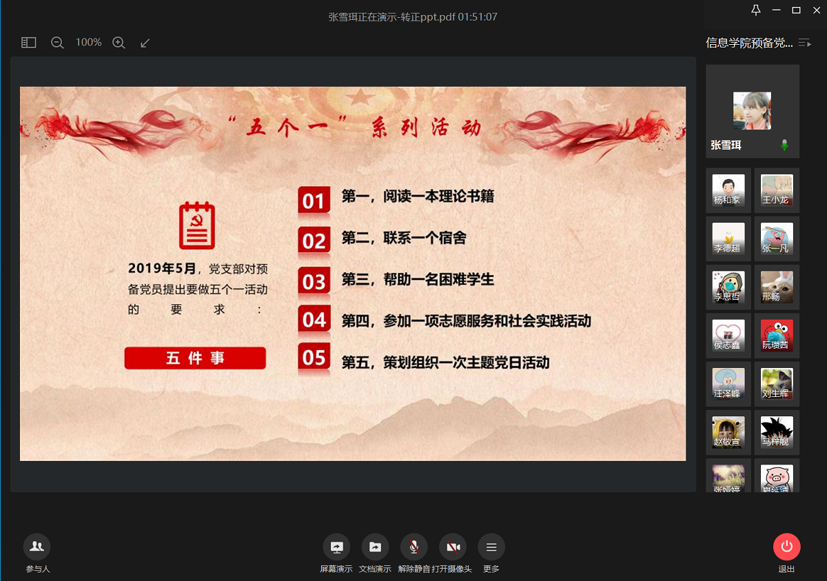 汇报过程中,预备党员从阅读一本理论书籍、联系一个宿舍、帮助一名困难学生、参加一项志愿服务和社会实践活动、策划组织一次主题党日活动等五个方面的内容对预备期一年的履职尽责情况作了汇报,并逐一解答了有关提问。受疫情影响,部分工作开展起来有困难,但是预备党员们敢于克服困难,及时调整方案,将”五个一”先锋工程内容落到实处,不忘初心,牢记使命。