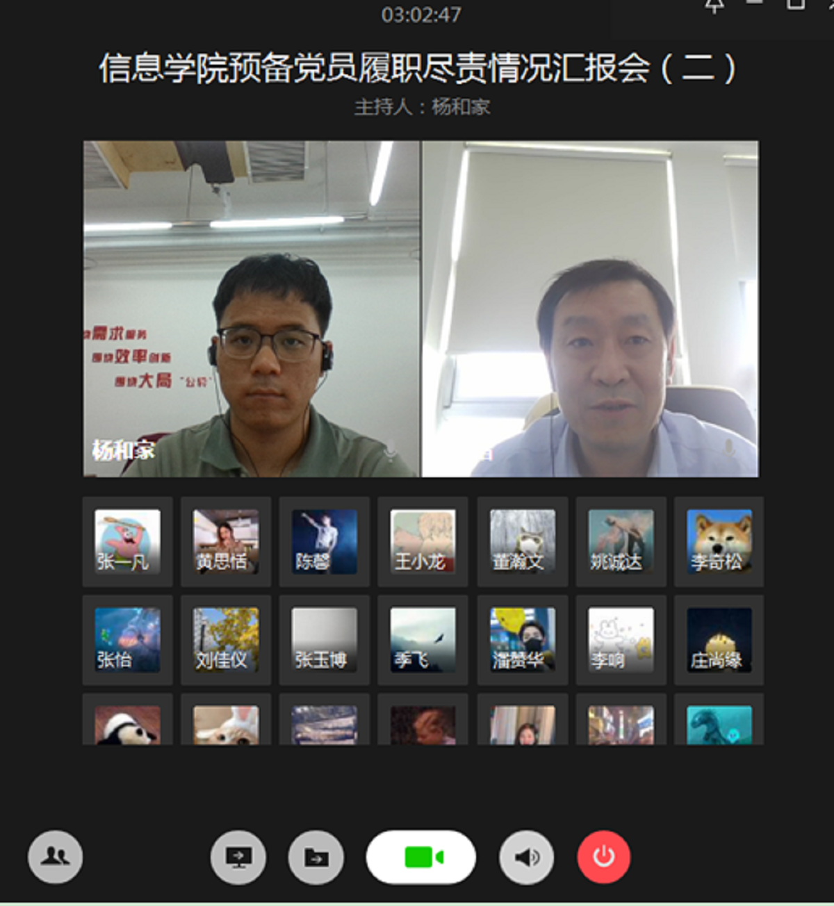 为加强对预备党员的教育和管理,综合考察预备党员一年预备期期间先锋模范作用的发挥,正规滚球app平台官网党委于5月21日和22日下午在企业微信召开了两场“预备党员履职尽责情况汇报会”。学院党委委员、支部书记、学生党建中心成员对63名预备党员在预备党员期内的履职尽责情况进行了考核评价。会议由学院学生党建中心副主任杨和家主持。