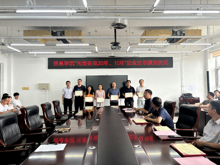 202471日,信息党委开展“光荣在党20年、10年”党员纪念证书颁发、“两优一先”表彰大会、新党员入党宣誓等系列活动。校党委组织部副部长王磊出席活动,学院领导班子成员、在党二十年党员、在党十年党员、“两优一先”代表、2024春季接收的全体预备党员参会。会议由学院党委书记王伟宾主持召开。