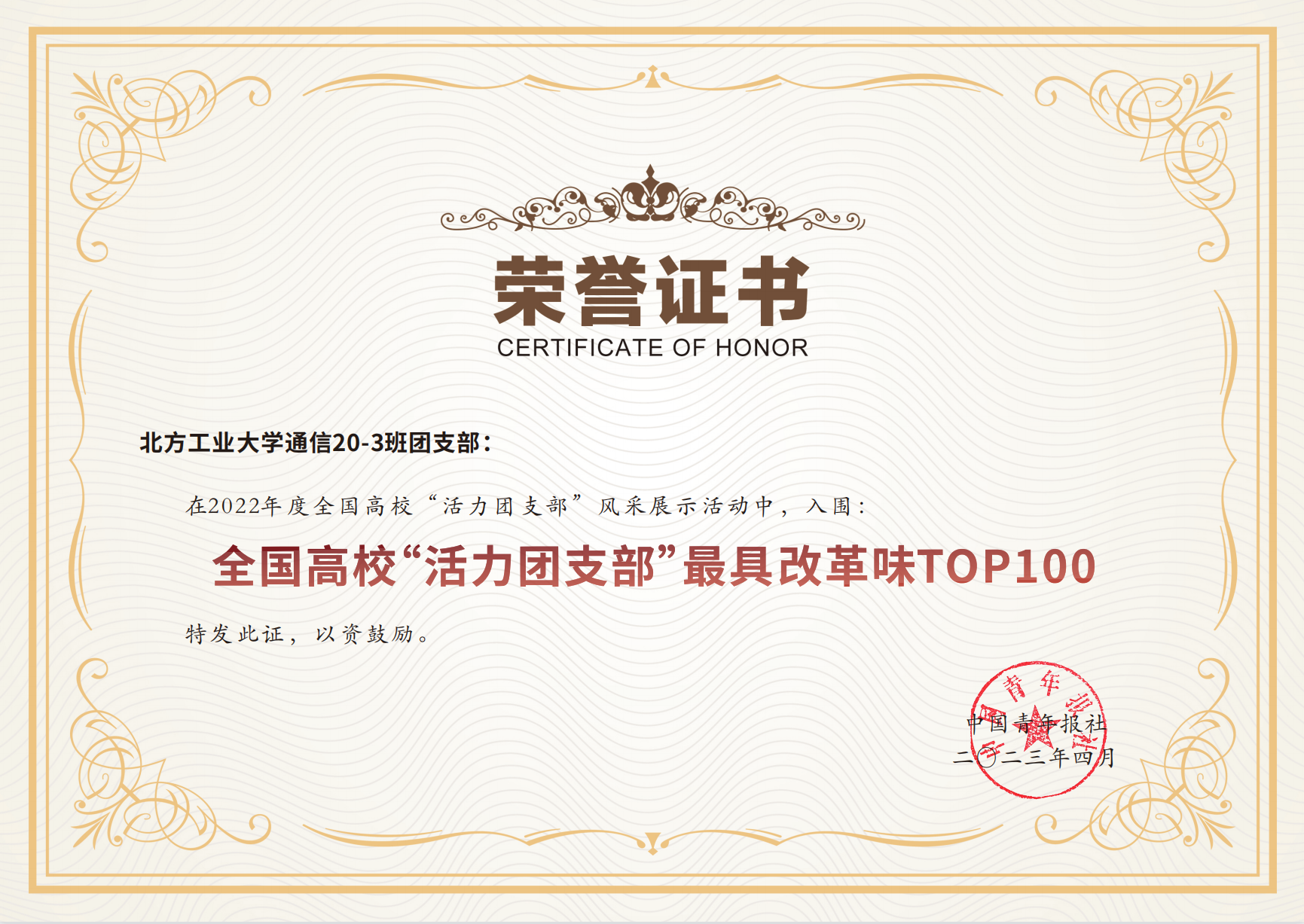 为深入贯彻“全团抓思想政治引领”、“全团大抓基层”、“全团抓学校”工作部署,落实《关于改革创新高校共青团工作切实增强思想政治引领实效的若干措施》,激发高校团支部活力,团中央组织开展2022年度全国高校“活力团支部”风采展示活动。滚球通信20-3班团支部经院内创建、学校推荐、省级遴选、网络投票等环节,在综合排序和最具改革味排序均进入TOP10,成功获评2022年度全国高校“活力团支部”,并在《中国青年报》新闻客户端进行展示报道。